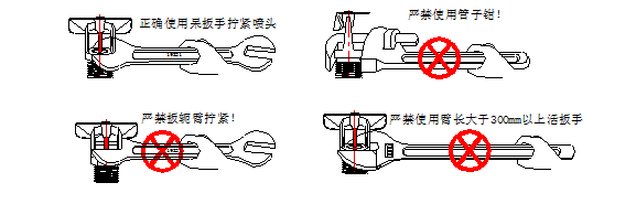 3、噴頭(tóu)安裝時應使用19的呆(dāi)扳手,並注意正確使用(扳(bān)手(shǒu)切勿撞到感溫(wēn)元件以免造成感溫元(yuán)件及(jí)框架間的結構部件損壞,而引起噴頭的安(ān)全隱患),如下圖所示。噴(pēn)頭擰緊力距為10-20N.m,嚴禁超過30N.m。經過(guò)碰撞、跌落、摔擊的噴頭不得使用。