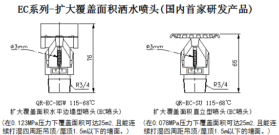 EC係列噴頭采用特(tè)殊設計的框(kuàng)架和K=115的較大(dà)流量和快速響應玻璃球,響(xiǎng)應時間(jiān)快,具有比常規灑水噴頭更大的保護範圍,適用於輕、中(zhōng)危險級場所,如商場、旅館、飯店、辦公樓(lóu)、醫院、博物館、工(gōng)業廠房(fáng)等場所。