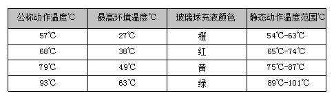 4、常用的玻璃球(qiú)噴頭公稱動(dòng)作溫度及顏色標誌(zhì):