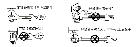 3、噴頭安裝時應使用(22X24)的呆(dāi)扳手的相(xiàng)應扳(bān)口,並注意正確使用,如下圖。噴頭擰緊力距
