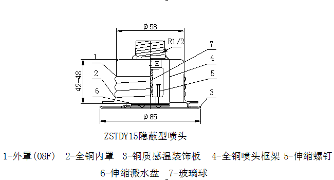(K) ZSTDY15快速(sù)/特殊隱蔽型玻璃球灑(sǎ)水噴頭是在普通噴頭外部加上(shàng)一套由特殊易熔合金焊接的感溫罩殼組成。其功能同標準ZSTX15下垂型(xíng)玻璃球灑水噴頭有(yǒu)相(xiàng)同之處外,還有其特別(bié)用途,因噴頭藏於天花板內,又有噴塑感(gǎn)溫裝(zhuāng)飾板掩蓋住天花板的開孔,因此: